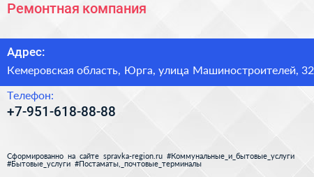 Ремонтная компания по адресу Кемеровская область, Юрга, улица Машиностроителей, 32 в дальнейшем Организация, размещена в следующих категориях:
