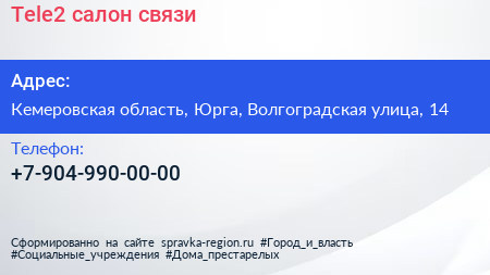 Tele2, салон связи по адресу Кемеровская область, Юрга, Волгоградская улица, 14 в дальнейшем Организация, размещена в следующих категориях: