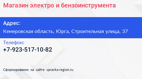 Магазин электро и бензоинструмента по адресу Кемеровская область, Юрга, Строительная улица, 37 в дальнейшем Организация, размещена в следующих категориях: