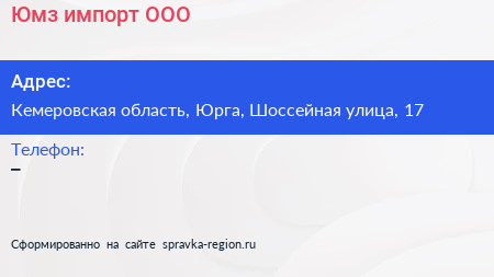 Юмз-импорт, ООО по адресу Кемеровская область, Юрга, Шоссейная улица, 17 в дальнейшем Организация, размещена в следующих категориях: