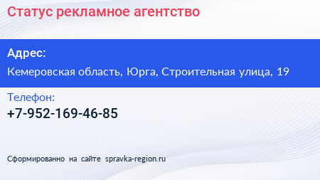 Статус, рекламное агентство по адресу Кемеровская область, Юрга, Строительная улица, 19 в дальнейшем Организация, размещена в следующих категориях: