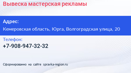 Вывеска, мастерская рекламы по адресу Кемеровская область, Юрга, Волгоградская улица, 20 в дальнейшем Организация, размещена в следующих категориях: