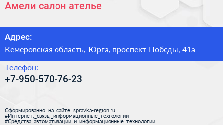Амели, салон-ателье по адресу Кемеровская область, Юрга, проспект Победы, 41а в дальнейшем Организация, размещена в следующих категориях: