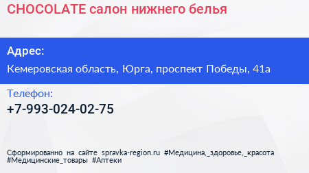 CHOCOLATE, салон нижнего белья по адресу Кемеровская область, Юрга, проспект Победы, 41а в дальнейшем Организация, размещена в следующих категориях: