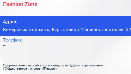 Fashion Zone по адресу Кемеровская область, Юрга, улица Машиностроителей, 32 в дальнейшем Организация, размещена в следующих категориях: