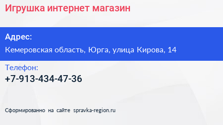 Игрушка, интернет-магазин по адресу Кемеровская область, Юрга, улица Кирова, 14 в дальнейшем Организация, размещена в следующих категориях: