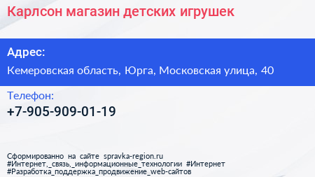 Карлсон, магазин детских игрушек по адресу Кемеровская область, Юрга, Московская улица, 40 в дальнейшем Организация, размещена в следующих категориях:
