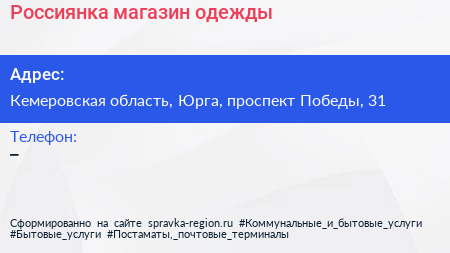 Россиянка, магазин одежды по адресу Кемеровская область, Юрга, проспект Победы, 31 в дальнейшем Организация, размещена в следующих категориях: