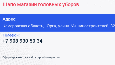 Шапо, магазин головных уборов по адресу Кемеровская область, Юрга, улица Машиностроителей, 32 в дальнейшем Организация, размещена в следующих категориях: