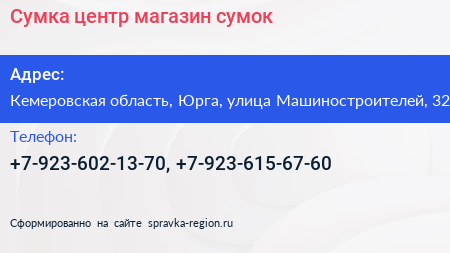 Сумка-центр, магазин сумок по адресу Кемеровская область, Юрга, улица Машиностроителей, 32 в дальнейшем Организация, размещена в следующих категориях: