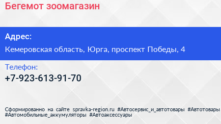Бегемот, зоомагазин по адресу Кемеровская область, Юрга, проспект Победы, 4 в дальнейшем Организация, размещена в следующих категориях: