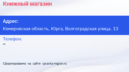 Книжный магазин по адресу Кемеровская область, Юрга, Волгоградская улица, 13 в дальнейшем Организация, размещена в следующих категориях:
