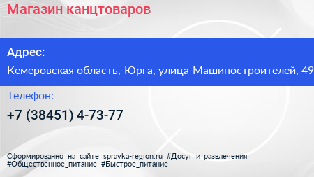 Магазин канцтоваров по адресу Кемеровская область, Юрга, улица Машиностроителей, 49 в дальнейшем Организация, размещена в следующих категориях: