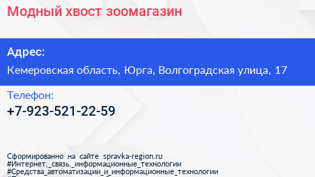 Модный хвост, зоомагазин по адресу Кемеровская область, Юрга, Волгоградская улица, 17 в дальнейшем Организация, размещена в следующих категориях: