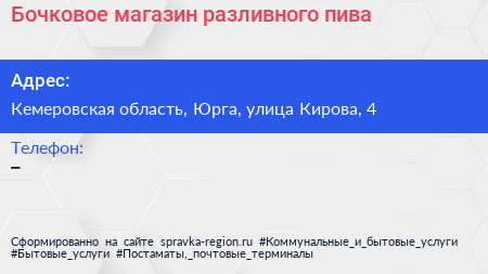 Бочковое, магазин разливного пива по адресу Кемеровская область, Юрга, улица Кирова, 4 в дальнейшем Организация, размещена в следующих категориях: