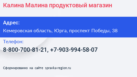 Калина-Малина, продуктовый магазин по адресу Кемеровская область, Юрга, проспект Победы, 38 в дальнейшем Организация, размещена в следующих категориях: