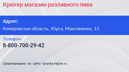 Крюгер, магазин разливного пива по адресу Кемеровская область, Юрга, Максименко, 15 в дальнейшем Организация, размещена в следующих категориях: