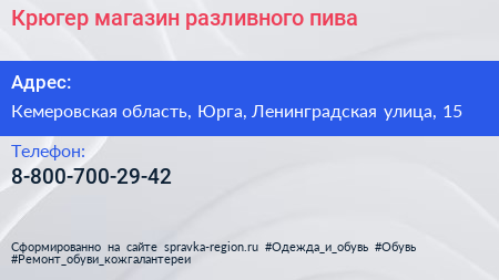 Крюгер, магазин разливного пива по адресу Кемеровская область, Юрга, Ленинградская улица, 15 в дальнейшем Организация, размещена в следующих категориях: