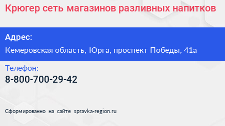 Крюгер, сеть магазинов разливных напитков по адресу Кемеровская область, Юрга, проспект Победы, 41а в дальнейшем Организация, размещена в следующих категориях: