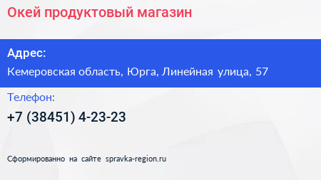 Окей, продуктовый магазин по адресу Кемеровская область, Юрга, Линейная улица, 57 в дальнейшем Организация, размещена в следующих категориях: