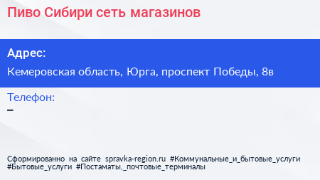 Пиво Сибири, сеть магазинов по адресу Кемеровская область, Юрга, проспект Победы, 8в в дальнейшем Организация, размещена в следующих категориях: