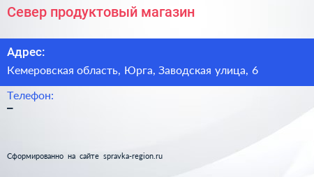 Север, продуктовый магазин по адресу Кемеровская область, Юрга, Заводская улица, 6 в дальнейшем Организация, размещена в следующих категориях: