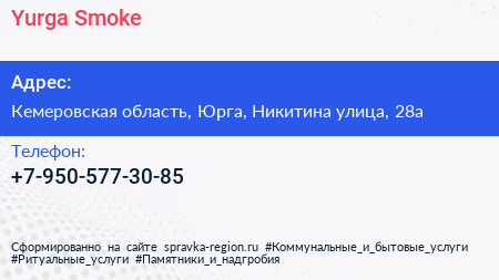 Yurga Smoke по адресу Кемеровская область, Юрга, Никитина улица, 28а в дальнейшем Организация, размещена в следующих категориях: