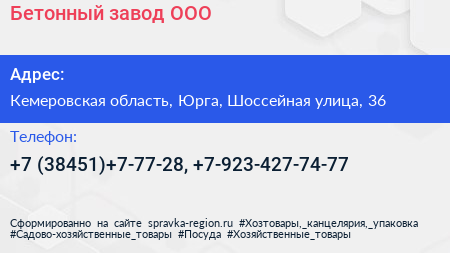 Бетонный завод, ООО по адресу Кемеровская область, Юрга, Шоссейная улица, 36 в дальнейшем Организация, размещена в следующих категориях: