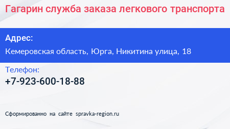 Гагарин, служба заказа легкового транспорта по адресу Кемеровская область, Юрга, Никитина улица, 18 в дальнейшем Организация, размещена в следующих категориях: