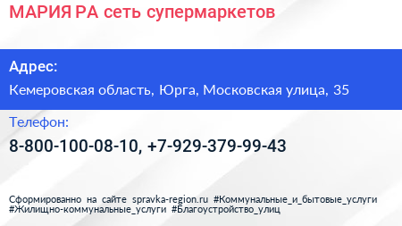 МАРИЯ-РА, сеть супермаркетов по адресу Кемеровская область, Юрга, Московская улица, 35 в дальнейшем Организация, размещена в следующих категориях: