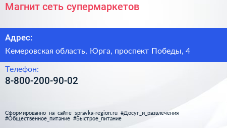 Магнит, сеть супермаркетов по адресу Кемеровская область, Юрга, проспект Победы, 4 в дальнейшем Организация, размещена в следующих категориях: