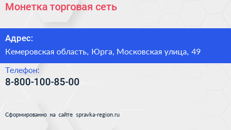 Монетка, торговая сеть по адресу Кемеровская область, Юрга, Московская улица, 49 в дальнейшем Организация, размещена в следующих категориях: