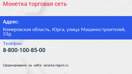 Монетка, торговая сеть по адресу Кемеровская область, Юрга, улица Машиностроителей, 53д в дальнейшем Организация, размещена в следующих категориях: