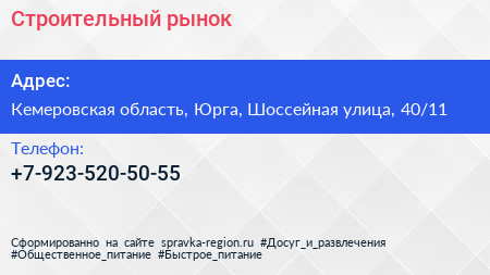 Строительный рынок по адресу Кемеровская область, Юрга, Шоссейная улица, 40/11 в дальнейшем Организация, размещена в следующих категориях: