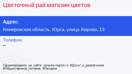 Цветочный рай, магазин цветов по адресу Кемеровская область, Юрга, улица Кирова, 13 в дальнейшем Организация, размещена в следующих категориях: