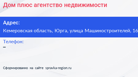Дом плюс, агентство недвижимости по адресу Кемеровская область, Юрга, улица Машиностроителей, 16 в дальнейшем Организация, размещена в следующих категориях: