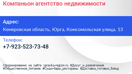 Компаньон, агентство недвижимости по адресу Кемеровская область, Юрга, Комсомольская улица, 13 в дальнейшем Организация, размещена в следующих категориях:
