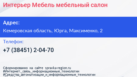 Интерьер-Мебель, мебельный салон по адресу Кемеровская область, Юрга, Максименко, 2 в дальнейшем Организация, размещена в следующих категориях: