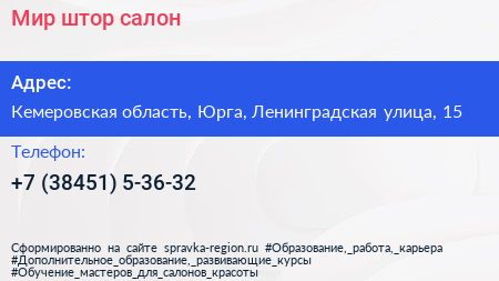 Мир штор, салон по адресу Кемеровская область, Юрга, Ленинградская улица, 15 в дальнейшем Организация, размещена в следующих категориях: