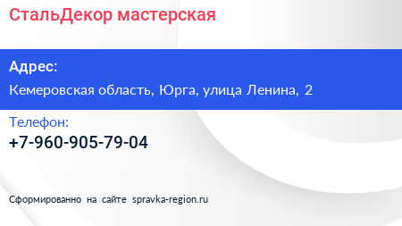 СтальДекор, мастерская по адресу Кемеровская область, Юрга, улица Ленина, 2 в дальнейшем Организация, размещена в следующих категориях: