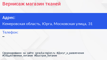 Вернисаж, магазин тканей по адресу Кемеровская область, Юрга, Московская улица, 31 в дальнейшем Организация, размещена в следующих категориях: