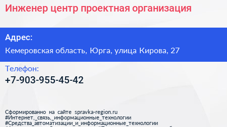 Инженер-центр, проектная организация по адресу Кемеровская область, Юрга, улица Кирова, 27 в дальнейшем Организация, размещена в следующих категориях: