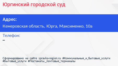 Юргинский городской суд по адресу Кемеровская область, Юрга, Максименко, 10а в дальнейшем Организация, размещена в следующих категориях: