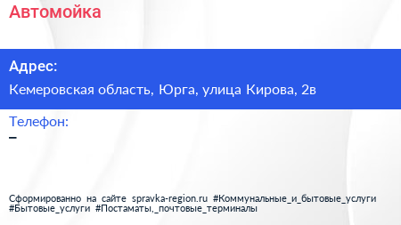 Автомойка по адресу Кемеровская область, Юрга, улица Кирова, 2в в дальнейшем Организация, размещена в следующих категориях: