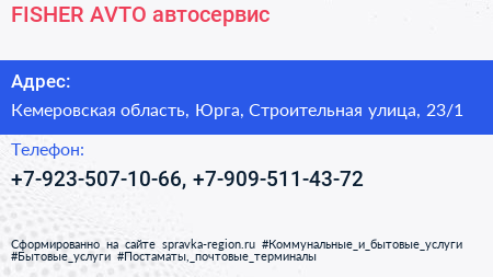 FISHER AVTO, автосервис по адресу Кемеровская область, Юрга, Строительная улица, 23/1 в дальнейшем Организация, размещена в следующих категориях: