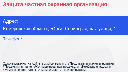 Защита, частная охранная организация по адресу Кемеровская область, Юрга, Ленинградская улица, 1 в дальнейшем Организация, размещена в следующих категориях: