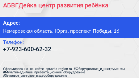 АБВГДейка, центр развития ребёнка по адресу Кемеровская область, Юрга, проспект Победы, 16 в дальнейшем Организация, размещена в следующих категориях: