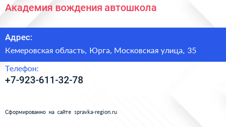Академия вождения, автошкола по адресу Кемеровская область, Юрга, Московская улица, 35 в дальнейшем Организация, размещена в следующих категориях: