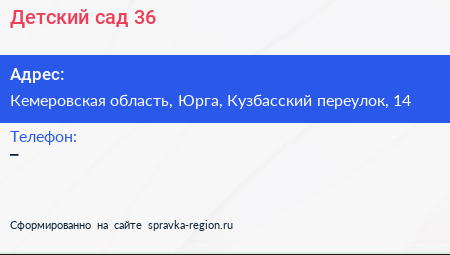 Детский сад №36 по адресу Кемеровская область, Юрга, Кузбасский переулок, 14 в дальнейшем Организация, размещена в следующих категориях: