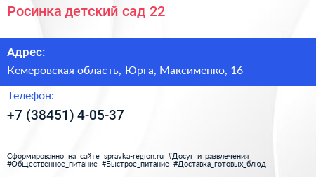 Росинка, детский сад №22 по адресу Кемеровская область, Юрга, Максименко, 16 в дальнейшем Организация, размещена в следующих категориях:
